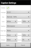 The CaptionSettings class displays a dialog allowing the user to select font and background styles for displaying subtitles. Also handles the selections and interacts with the MediaPlayer via MediaPlayerControl.